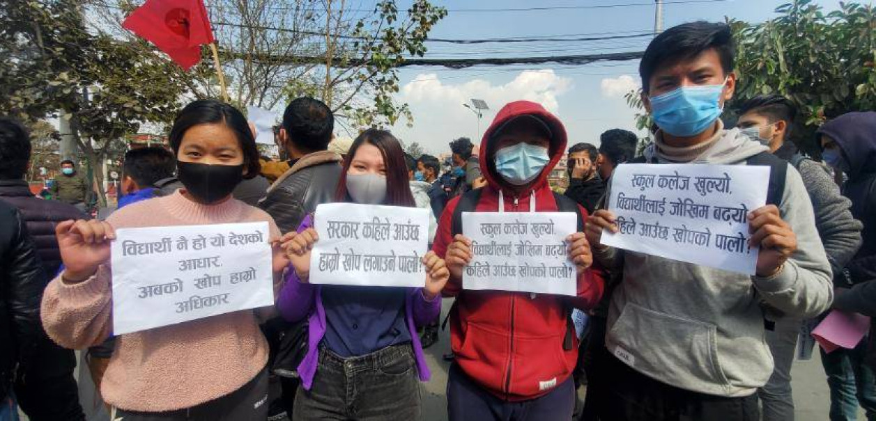 उनीहरूले ‘सरकार कहिले आउँछ खोप लगाउने हाम्रो पालो, स्कूल/कलेज खुल्यो कहिले आउँछ खोप लगाउने पालो’ जस्ता नारा लेखेका प्लेकार्ड लिएर प्रदर्शन पनि गरेका छन्। सरकारले पहिलो चरणमा स्वास्थ्यकर्मीहरूलाई र दोस्रो चरणमा सरकारी कर्मचारी तथा जनप्रतिनिधिहरू लगायतलाई कोरोनाविरूद्ध खोप दिएको छ।