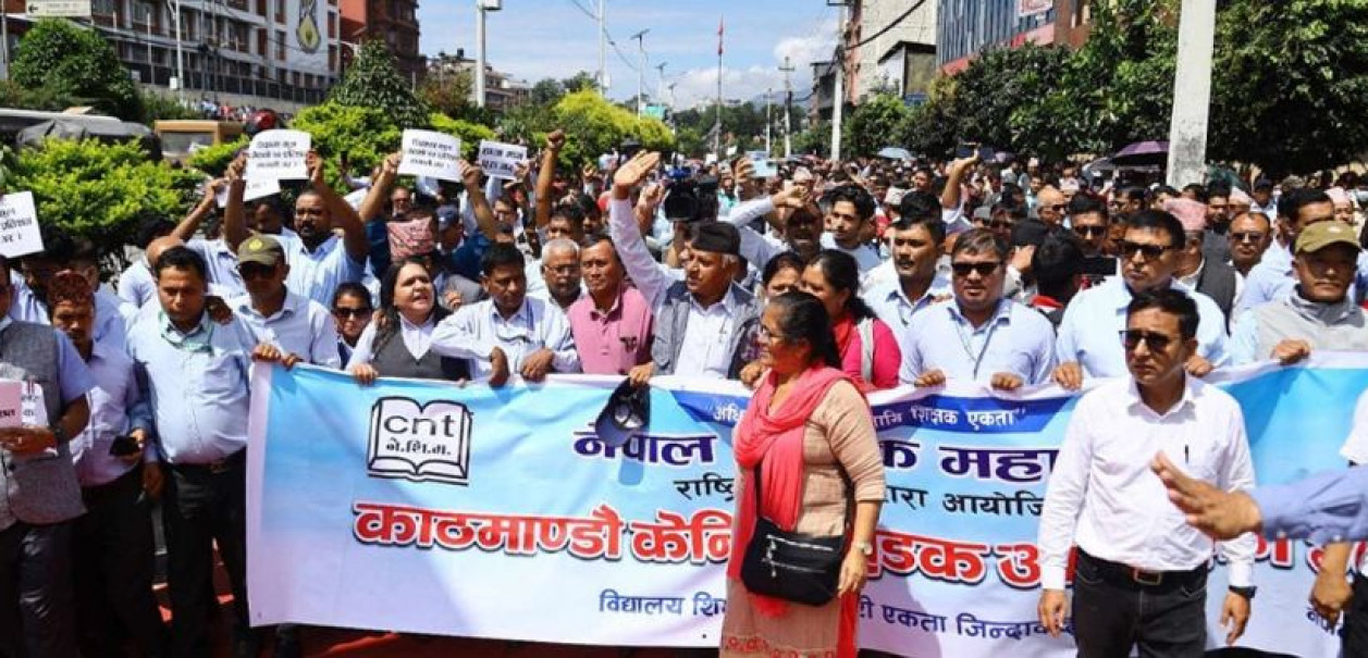 नेपाल शिक्षक महासंघको नेतृत्वमा देशभरका शिक्षक, कर्मचारीहरू आन्दोलनका लागि काठमाडौँ आएका छन्। हिजो संविधान दिवसको अवसरमा सरकारले सार्वजनिक बिदा दिएको थियो। आजदेखि अनिश्चितकाल सम्मका लागि देशभरका सामुदायिक विद्यालय बन्द हुन लागेका हुन्।