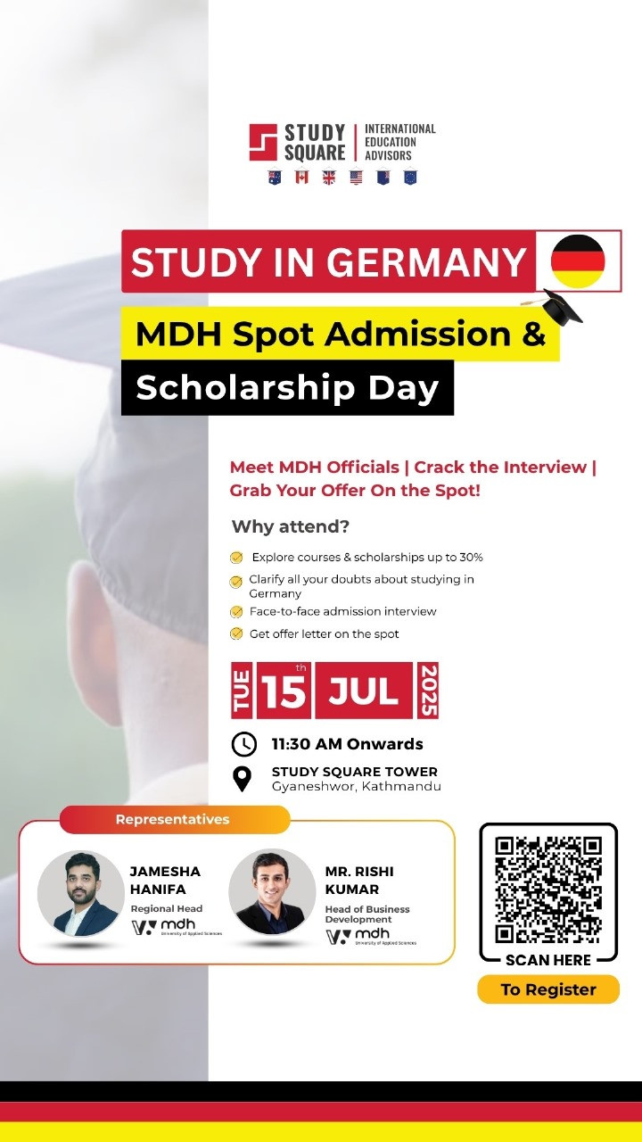काठमाडौं, आषाढ ३१ – जर्मनीको MDH – University of Applied Sciences का लागि आयोजित विशेष स्पट एडमिशन तथा छात्रवृत्ति कार्यक्रम आज काठमाडौंको ग्यानेश्वरस्थित Study Square Tower मा सफलतापूर्वक सम्पन्न भएको छ।